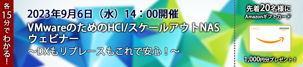 各15分でわかる!VMwareのためのHCI/スケールアウトNAS ウェビナー ~DXもリプレースもこれで安心!~