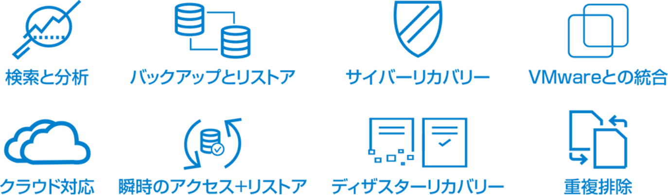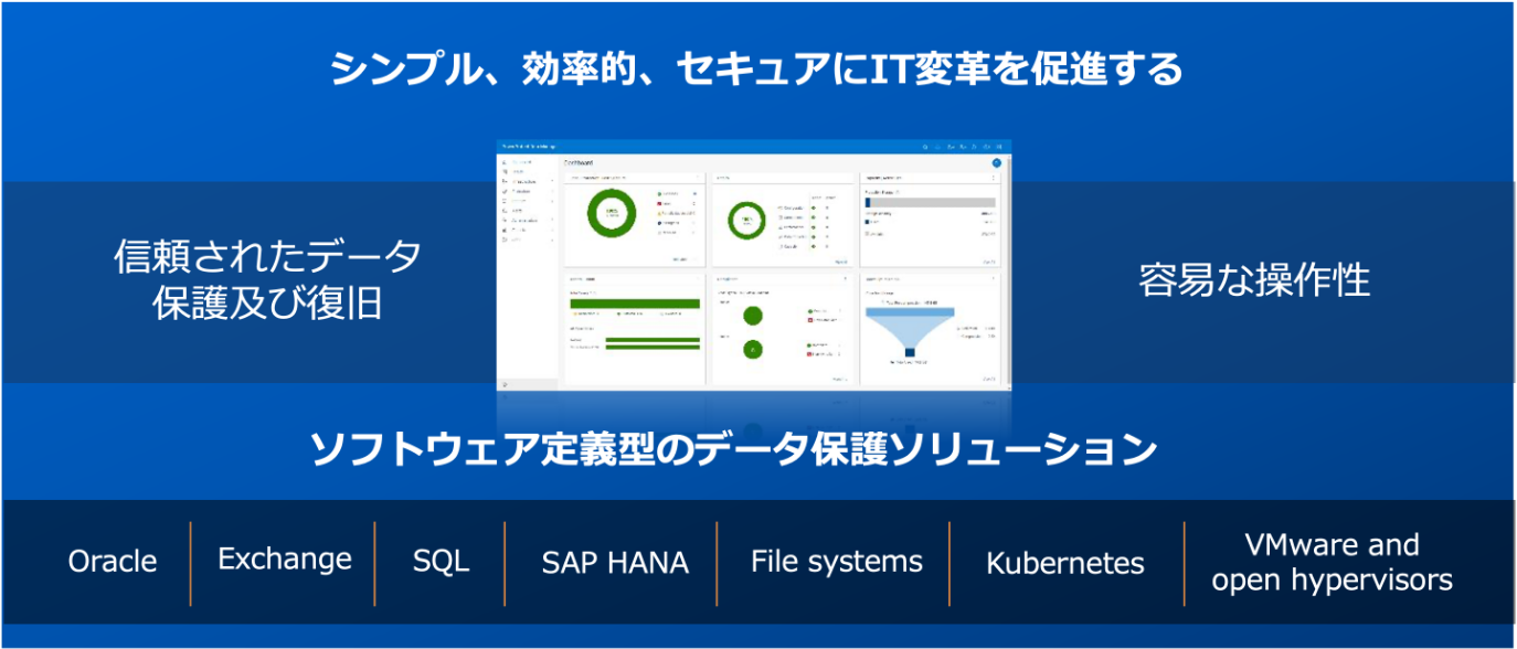 物理、仮想、クラウドの各種環境向けに、ソフトウェアデファインド データ保護、自動検出、重複排除、運用の俊敏性、セルフサービス、ITガバナンスを提供します。
